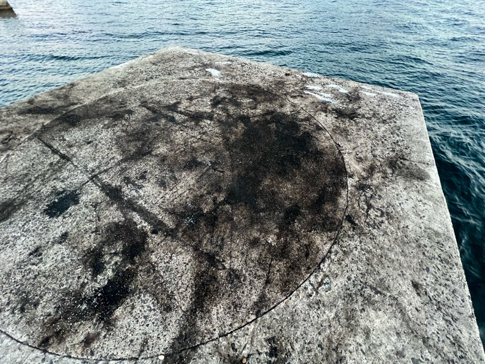 常夜灯の在る堤防先端に行って見ると、確かにイカの墨跡で真っ黒になっている。