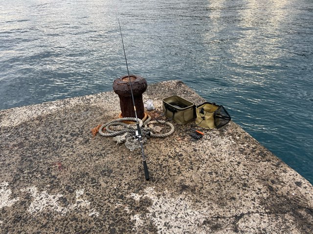 この堤防に到着して時先行で釣りをしていた人がカゴ釣りをやっていたので、話しかけるとタナや水深を教えてくれた。