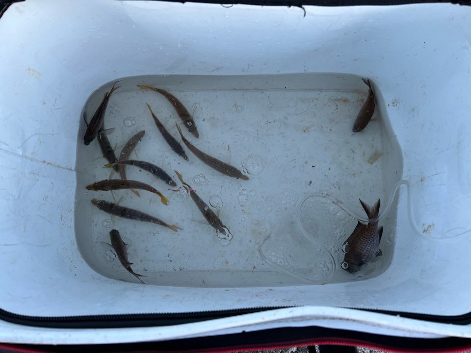 スズメダイ交じりだが10匹以上生きエサを確保。