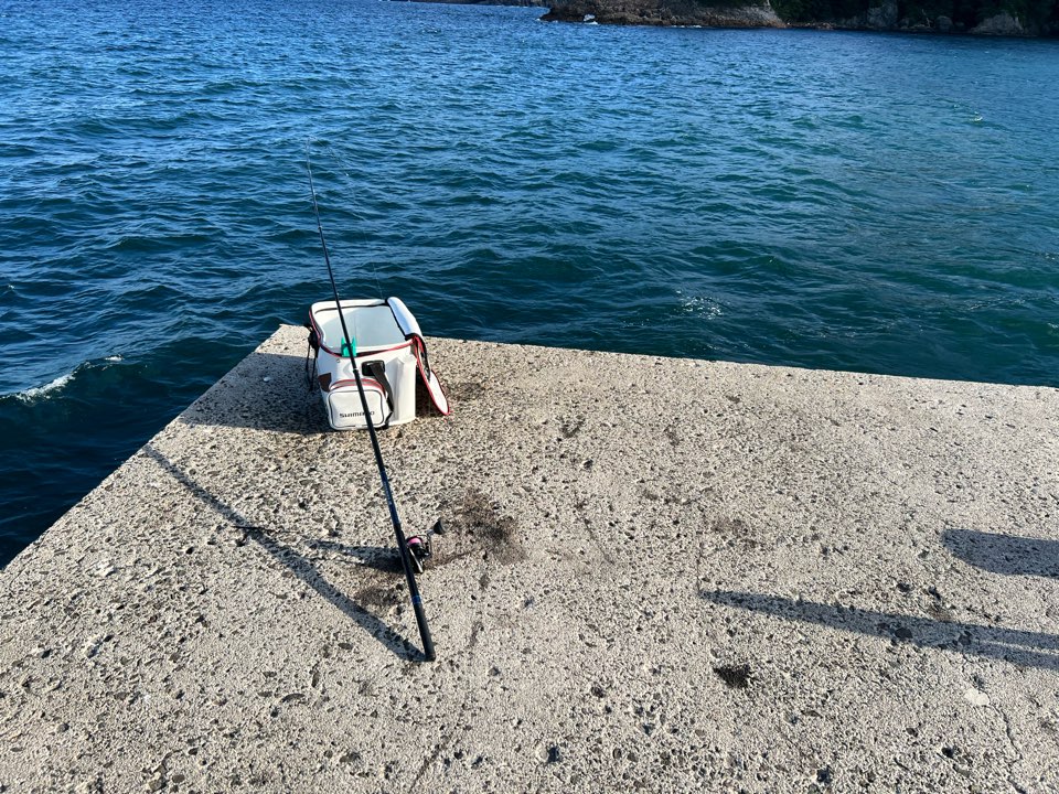 アオリイカ狙いの竿を出しつつもサビキで豆アジを釣っていると、ウキが突然海中に引き込まれる鋭いアタリが出た。